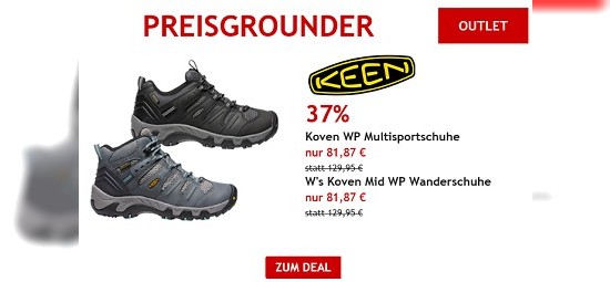 Der nächste Trip kann kommen! Bei dem heutigen Preisgrounder von bergfreunde.de dreht sich alles um Wander- & Multisportschuhe. Ihr habt die Wahl zwischen zwei Modellen. Die "KEEN - Koven WP - Multisportschuhe" bekommt ihr in den Größen US 7,5 - 14 für nur noch 81,87€ statt 129,95€ und die "KEEN - Women's Koven Mid WP - Wanderschuhe" bekommt ihr in den Größen UK 5,5 - 11 für nur noch 81,87€ statt 129,95€ und damit insgesamt 37% günstiger als bisher. Und, habt Ihr schon einen Favoriten?