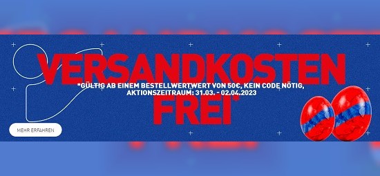 Euro Ostergeschenke versandkostenfrei bestellen? Möglich ist das bei intersport.de. Noch bis zum 02.04.23 spart ihr euch 3,95€. So hoch liegen normal die Versandkosten in diesem shop. Bei intersport findet Ihr ein breites Sortiment an Bekleidung, Ausrüstung und Schuhen, beispielsweise zum Klettern, Laufen oder Biken. Außerdem gibt es jeden Tag den "Deal of the Day" mit Top-Rabatten. Vielleicht ist für Euch auch etwas Passendes dabei?