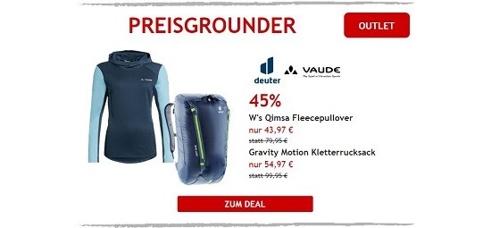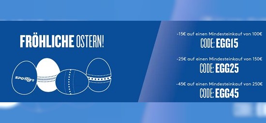 Ordentlich sparen könnt ihr aktuell mit der Oster-Aktion von sportler.com. Nur noch bis morgen (19.04.2022) gibt es hier gestaffelte Gutscheinen. Wer mehr einkauft, bekommt einen größeren Rabatt und das bis zu 45€! Dabei gibt es mit dem Code "EGG15 " 15€ Rabatt bei einem Warenkorb ab 100€ ,25€ Rabatt mit dem Code "EGG25 " ab einem Warenwert von 150€ und bei einem Warenkorb von 250€ und mehr gibt es mit dem Code "EGG45 " gleich 45€. Rabatt! Und das Beste: Es funktioniert auch bei schon reduzierten Sachen. Ausgenommen Bikes, Elektronik und Gift Cards.