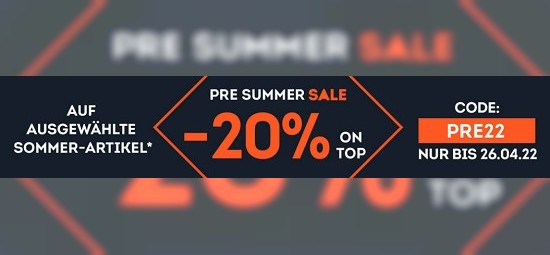 Der Sommer steht schon in den Startlöchern! Grund genug für sportscheck.com einen Pre Summer Sale zu veranstalten, bei dem Ihr 20% On Top auf ausgewählte Artikel sparen könnt - das heißt sogar bereits reduzierte Waren werden noch mal 20% billiger mit dem Gutscheincode "PRE22"! Gilt nur für gekennzeichnete Artikel bis 26.04.2022