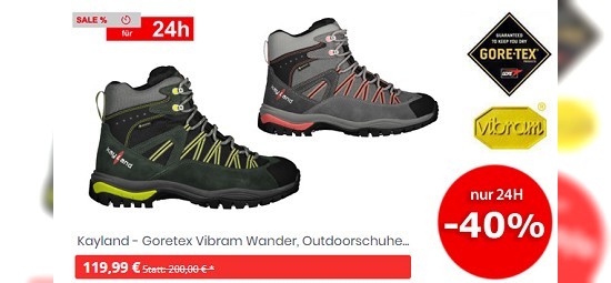 Da ist er wieder, der 24h-Sale bei hive-outdoor.com. Ordentlich sparen könnt ihr dieses Mal z.B. bei den  "Kayland - Goretex Vibram Wander, Outdoorschuhe - Orbit GTX", die ihr in vielen Größen für nur noch 119,99€ (- 40%) bekommt, den richtien Durchblick behaltet ihr mit der "LACD - Photochromic Sport- Sonnenbrille" die es für 39,99€ (UVP 99,95 / - 60%) gibt und gut angezogen seid ihr mit dem "Craghoppers - funktionelles Stretch Dynamic Langarm"  für 19,99€ (-56%). Reinschauen lohnt sich bestimmt.