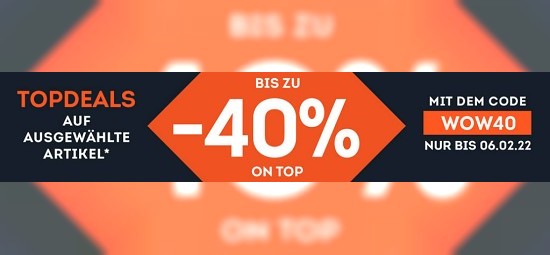 Bei dieser Rabattaktion von sportscheck.com drehen nicht nur die Preise durch. Vom coolen Funktionsshirt bis hin zur warmen Winterjacke, noch bis zum 06.02.2022 erhaltet ihr auf ausgewählte Artikel nochmal bis zu 40% on Top. Für den Extra-Rabatt müsst ihr lediglich den Code "WOW40" in den Warenkorb eingeben. Ausgenommen Artikel mit Direktversand durch Partner.
