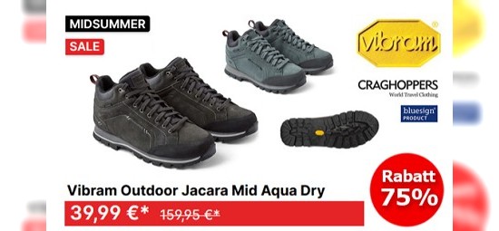 Und auch am heutigen Sonntag ist er wieder on, der 24h-Sale bei hive-outdoor.com. Sparen lässt sich dieses Mal z.B. bei dem "Craghoppers - Vibram Outdoor Jacara", das ihr für nur noch 39,99€ (- 75%) bekommt, cool unterwegs seid ihr danke der "Sigg - MyPlanet Trinkflasche ", diese gibt es hier für 19,99€ (UVP 11,09€ / - 48%) und perfekt für den nächsten Ausflug ans Meer oder an Seen ist das  "NOMADIX - Do AnythingTowel - Reise- und Sporthandtuch" . Dieses gibt es hier für nur noch 7,99€ statt 39,95€. Reinschauen lohnt sich bestimmt.