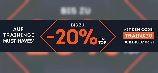 Fit in den Frühling! Bei sportscheck.com erhaltet Ihr noch bis zum 7.3.21 einen Zusatz-Rabatt von bis zu 20 % auf zahlreiche Artikel rund um die Themen Training und Fitness. Den größten Teil der Aktion macht Bekleidung aus, Ihr findet hier beispielsweise Tights, T-Shirts, Funktionswäsche, Shorts und vieles mehr. Die Mehrheit der Artikel ist bereits vorab bis zu 30 % reduziert - mit dem Aktionsrabatt (Code "TRAINX20") ergeben sich tolle Deals, egal ob Ihr Zuhause Yoga macht oder eine Runde Laufen geht.