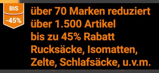 Bei outdoortrends.de bekommt Ihr noch heute Rabatte von bis zu 45 % auf zahlreiche Ausrüstungs- und Bekleidungsdeals, von Rucksäcken über Chalk Bags bis hin zu Schlafsäcken. Außerdem sind viele aktuelle Artikel 15 % günstiger zu haben - ein Blick sollte sich lohnen!