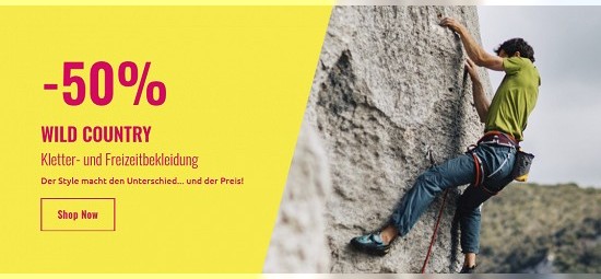 Ihr geht gern steil, ob draußen oder in der Kletter- bzw. Boulderhalle? Dann setzt doch mal einen Haken, damit ihr euch diese Aktion von sportler.com in Ruhe ansehen könnt: Auf etwa 30 Kletter- und Freizeitbekleidungsartikel von Wild Country gewährt euch der Shop bis zu 50% Rabatt. T-Shirts, Tops und Sport-BH´s sind ebenso vertreten wie kurze und lange Kletterhosen sowie eine Handvoll Jacken. Die reduzierten Preise starten bei 15€ für eine Cap, maximal könnt ihr 100€ (UVP 200€) für die "Wild Country Curbar"-Kapuzenjacke für Herren ausgeben - und spart dabei die erwähnten 50%. Die Jacke ist in den Größen 46 bis 52 in rot und schwarz erhältlich. Und, schlagt ihr auch zu?