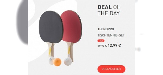 Noch eine Idee, die Zuhause-Zeit sinnvoll und gesund zu nutzen: Tischtennis! Mit Ball und Schläger könnt Ihr Euch beim heutigen "Deal of the Day" von intersport.de günstig ausstatten. Das "TECNOPRO PRO 2000"-Tischtennis-Set gibt es nur heute (21.4.20) für nur 12,99€ statt der UVP von 19,99€ - und damit 35% günstiger als bisher. Außerdem entfallen bei dem Shop momentan die Versandosten. Und, wer hat Aufschlag?
