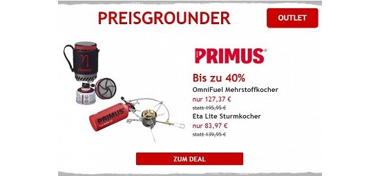Ob Koffergasgrill, Partygrill oder ein expeditionstauglicher Gaskocher, im Outlet der bergfreunde findet Ihr für jeden Anspruch etwas. Rund 200 Artikel rund um das Thema Outdoorküche stehen mit Rabatten von bis zu 45% zur Verfügung, unter anderem auch der von vielen Kunden gelobte "Primus Eta Express Stove"-Gaskocher, den Ihr für 69,97€ statt 99,95€ erhaltet - und damit 30% günstiger als bisher. Und, was gibt´s zu essen?