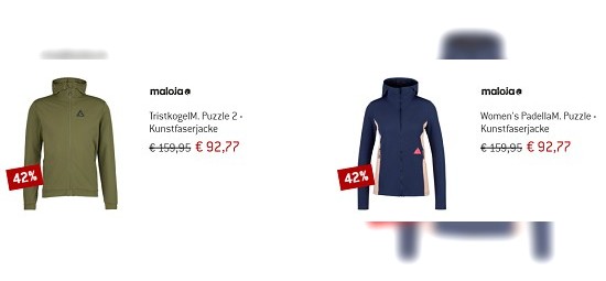 Ein Beispiel gefälligst? Die "Maloja-TristkogelM. Puzzle 2 - Kunstfaserjacke" bekommt ihr hier in vier verschiedenen Farben für nur noch 92,77€ statt wie bisher 159,95€. Die Jacke ist für wandern und Freizeit gleichermaßen geeignet. Sie ist stretchy, isolierend und sieht dabei noch top aus. Woraf wartet ihr noch?
