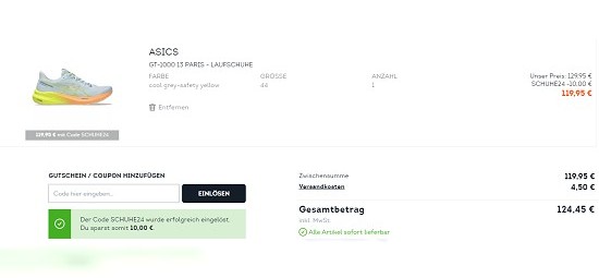 Optimal für euren nächsten Run sind die: "ASICS GT-1000 13 PARIS - Laufschuhe" für 119,95€ (zzgl. 4,50€ Versand) statt der UVP von 129,95€ - und damit insgesamt 10€ günstiger als bisher. Überzeugt euch am besten gleich selbst.