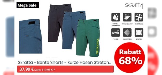Lust auf ein paar Deals? Einige absahnen könnt ihr beim 24h-Sale von hive-outdoor.com. Sparen lässt sich dieses Mal z.B. bei der "Skratta - Bente Shorts - kurze Hosen Stretch Radhose Wanderhose", diese gibt es hier für nur noch 37,99€ (- 68%), perfekt für den jede Art von Sportaktivität seid ihr mit der "LACD - Photochromic Sport- Sonnenbrille" ausgestattet, für diese zahlt ihr hier nur noch 39,99€ (UVP 99,95€ / - 60%) und alles sicher perfekt habt ihr dank des "BENCH - große Umhängetasche Reisetasche". Diese gibt es hier für nur noch 16,99€ statt 37,95€. Reinschauen lohnt sich bestimmt.