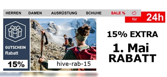 Lust auf 15% extra? Dann klickt unbedingt bei hive-outdoor.com vorbei, denn dort bekommt ihr nur am heutigen Mittwoch (01.05.2024) einen Extra-Rabatt von 15% auf das komplette Sortiment des Shops, also auch auf bereits reduzierte Ware. Die Rabatte der vergünstigten Artikel betragen vorab schon bis zu 70% - mit der zusätzlichen Reduzierung von 15% (Gutscheincode "hive-rab-15") kommen so richtig tolle Angebote zustande.