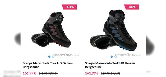 Die Scarpa Marmolada Trek HD Damen Bergschuhe (UVP 269,99 €) sind die perfekte Wahl vielseitige Wanderer, den dieser Allrounder ist wasserdicht und atmungsaktiv, hat eine griffige Vibram Sohle und passt wie eine Socke an Deinen Fuss Dank der Scarpa Sock-Fit-XT-Technologie. Im Moment ist dieser Bergschuh 40% reduziert und kostet nur noch 161,99€! Auch für Herren erhältlich als Scarpa Marmolada Trek HD Herren Bergschuhe, zum gleichen Preis.