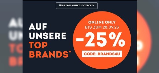 Einen Markensale, bei dem Ihr einen Zusatzrabatt von 25 % abstauben könnt, hat sportscheck.com aktuell am Start. Im "Top Brands Bestseller"-Sale gibt es noch bis zum 25.09.2023 mit Eingabe des Gutscheincodes "BRANDS4U" einen 25%-prozentigen Rabatt on top. On top deshalb, weil die Aktion auch auf bereits reduzierte Artikel angewendet werden kann.
