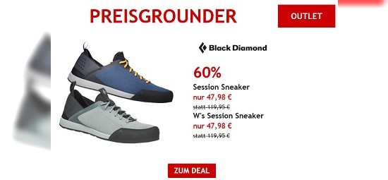 Ihr sucht einen Schuh fürs kletter und den Alltag gleichermaßen? Mit dem coolen Session - Sneaker aus dem Hause Back Diamond, seid ihr auf jeden Fall gut ausgestattet. Der heutige Preisgrounder von bergfreunde.de beschert Euch einen Rabatt von 60 % auf zwei Farbvarianten des "BLACK DIAMOND - Session - Sneaker" und kostet damit nur heute 47,98 € statt der UVP von 119,95 €. Bei den meisten Varianten ist auch die Größenauswahl noch gut. Schaut doch mal rein.
