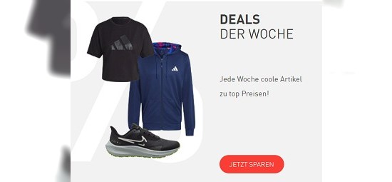 Zu guten Preisen an Adidas, Nike and The North Face kommen? Möglich machen es die "Deals der Woche" von intersport.de. Von dem bequemen Kapuzensweater für Herren aus dem Hause Adidas, Laufschuhe von Nike, Trekkinghalbschuhe von The North Face bis hin zum klassischen T-Shirt von Adidas, ist hier alles vertreten. Sparen lassen sich damit mal eben bis zu 48%.